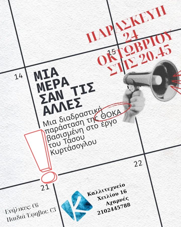 Την Παρασκευή 24 Οκτωβρίου, στο θεατρίδιο του Καλλιτεχνείο, επανέρχεται το έργο μου “Μια Μέρα Σαν Τις Άλλες”. Μια διαδραστική παράσταση που φιλοδοξεί να ψυχαγωγήσει και να προβληματίσει. Καλή επιτυχία Ευθύμη,